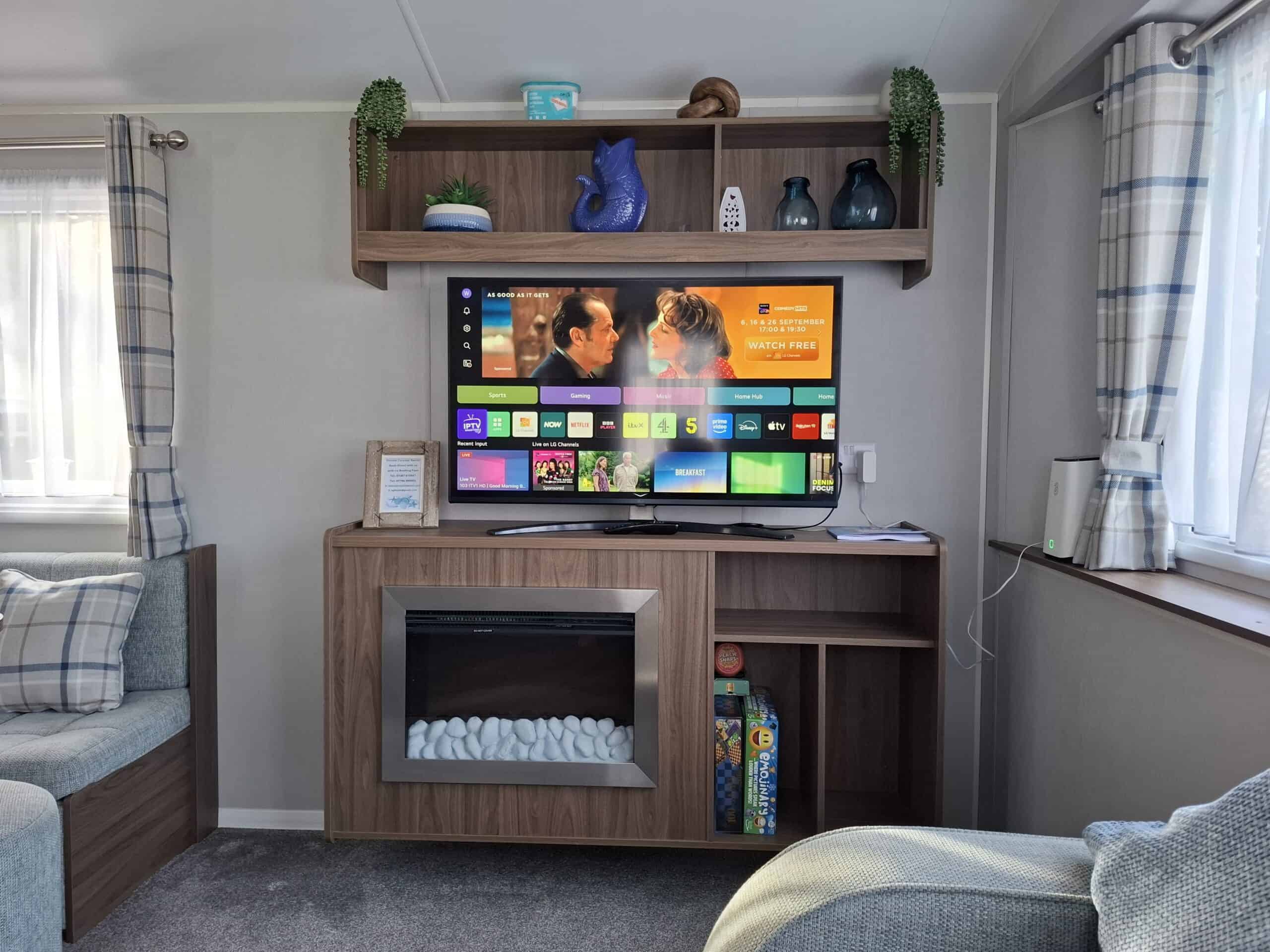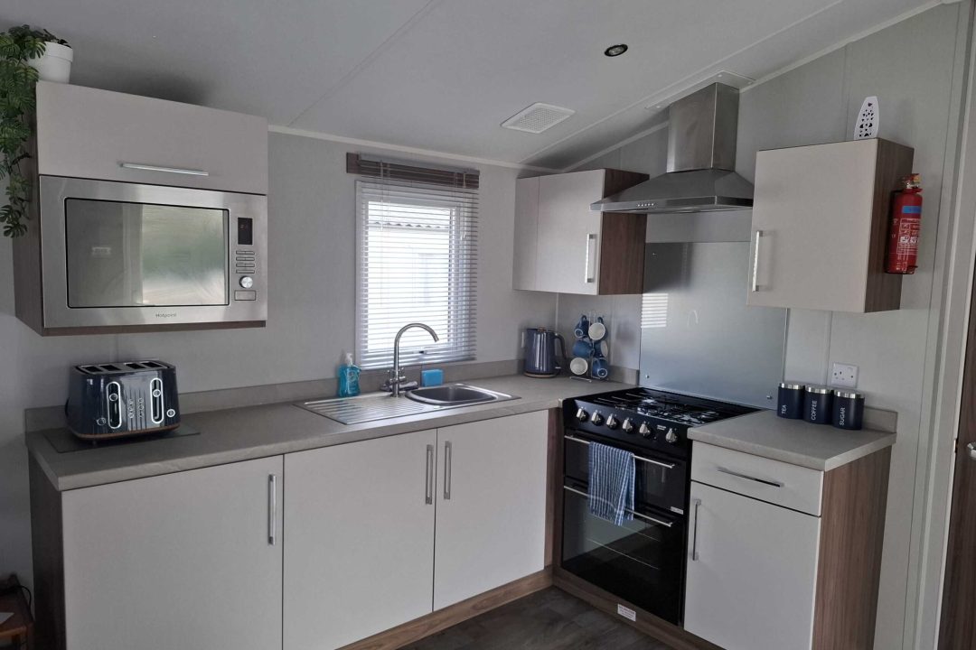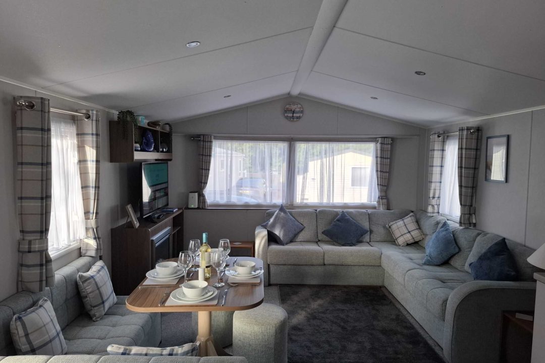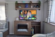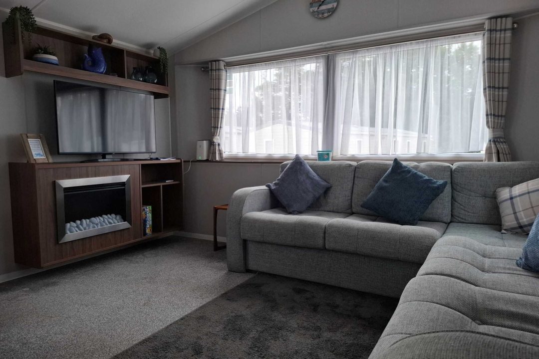 The open plan lounge is bright with a large Conner sofa and a coffee table. There is a 43inch smart flat-screen TV, and electric fire. Gas central heating, one of the corner sofas converts to make an additional double bed.