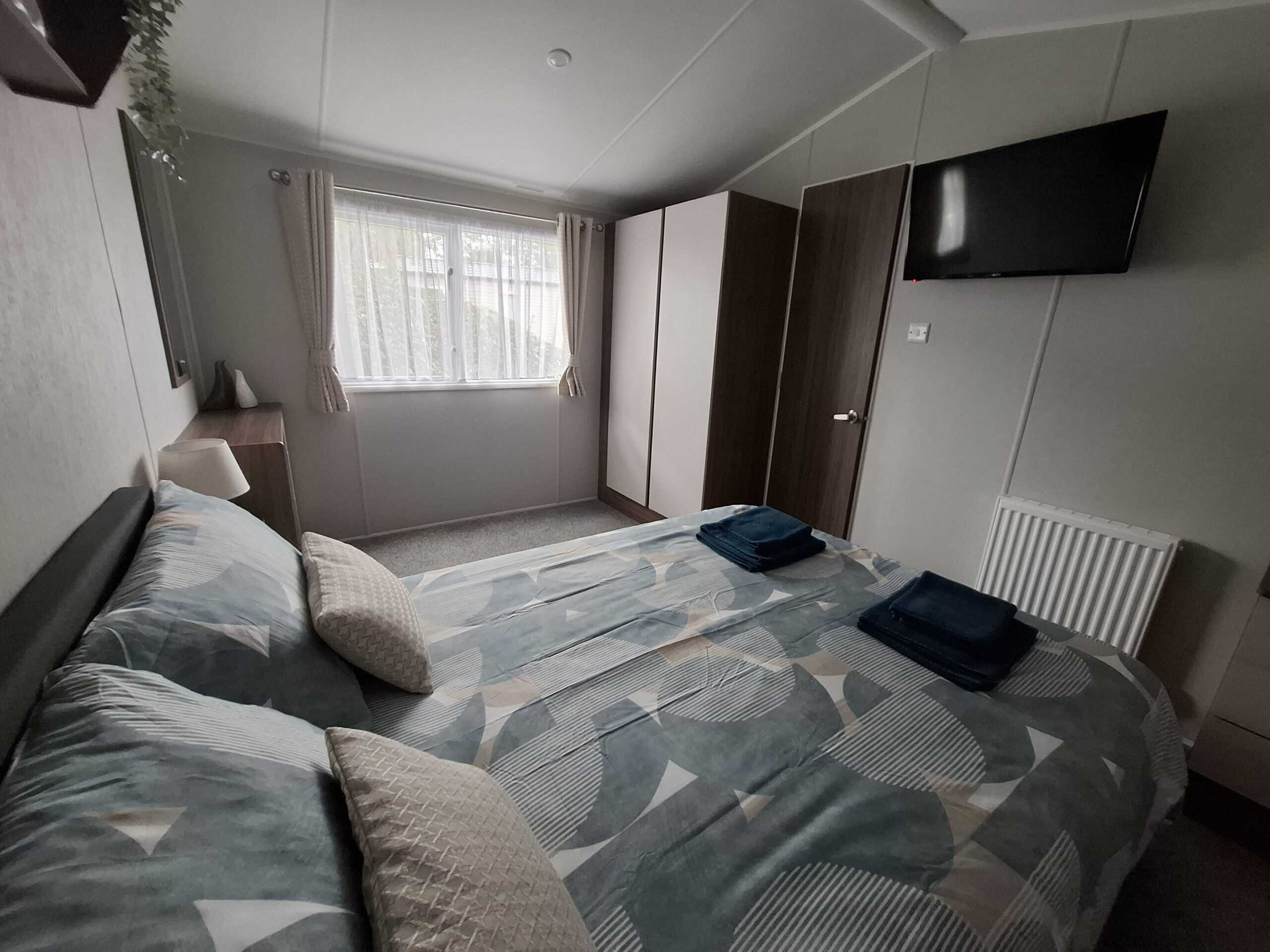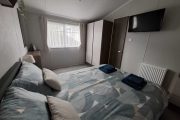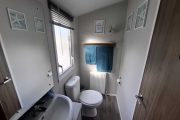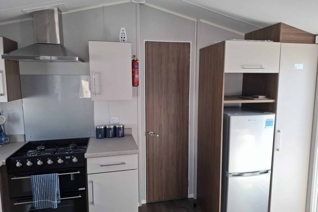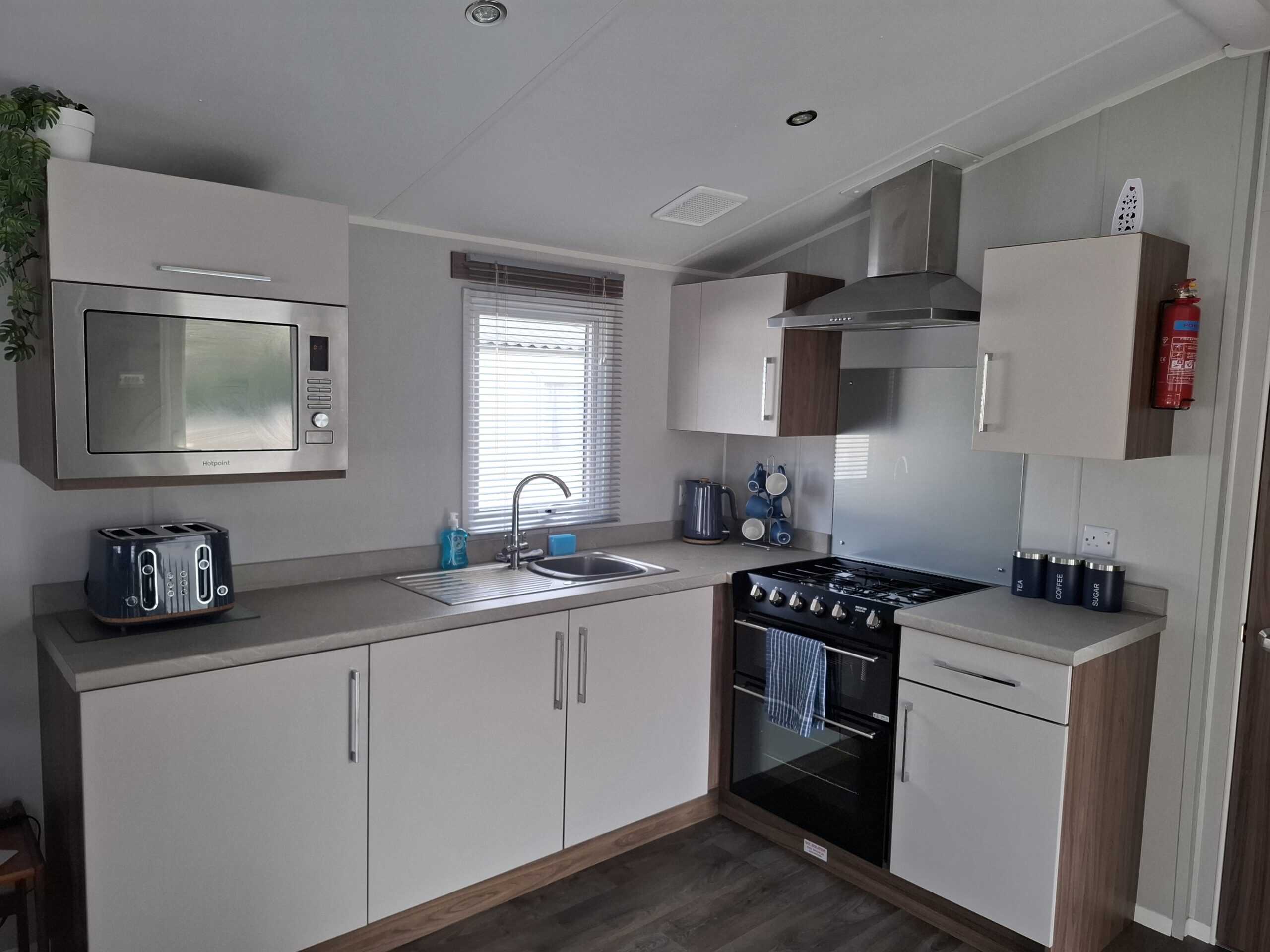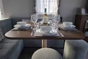 The open plan lounge is bright with a large Conner sofa and a coffee table. There is a 43inch smart flat-screen TV, and electric fire. Gas central heating, one of the corner sofas converts to make an additional double bed.