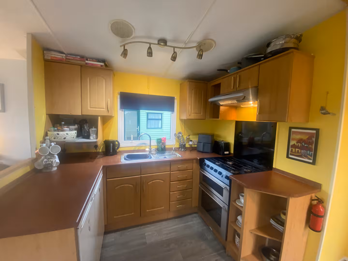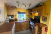 The main bathroom has a shower and toilet, and there’s a small toilet adjacent to the main bedroom. The kitchen, dining and living area are one open space. The kitchen is fully equipped for cooking, with a fridge, a freezer, a gas hob, and a gas oven with grill. There’s also a 5l air fryer.