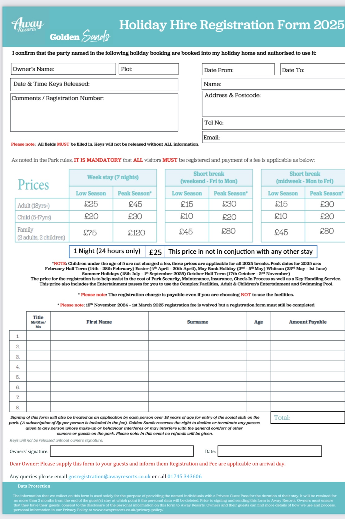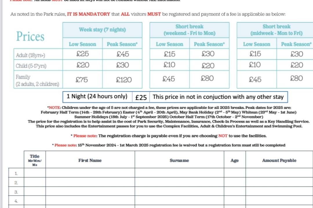 14. The hirer shall notify the caravan owners in writing with any changes to person(s) listed on the booking form at the earliest possible opportunity and in any event, prior to arrival at the holiday park.